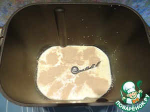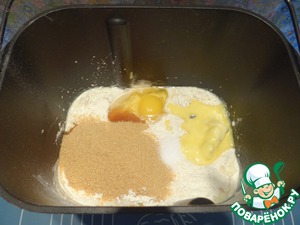В ведерко хлебопечки добавляем коричневый сахар, просеянную муку, размягченное сливочное масло, соль, яйцо.