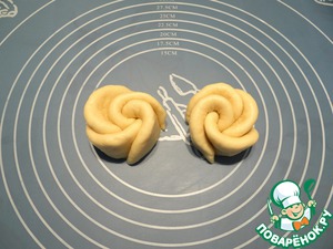 Получается 2 цветочка. Таким же образом изготовляем остальные цветочки, в конце останется 2 кусочка теста, раскатываем из них кружочки, разрезаем пополам и складываем четыре половинки, заходя друг на друга, сворачиваем в цветок.