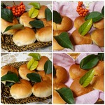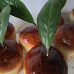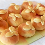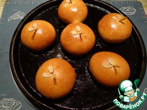 Затем ломаем деревянный шампур, втыкаем в серединку каждого пирожка. Смазываем пирожки взбитым яйцом, у шампура украшаем каждый пирожок миндальными лепестками - это будут листочки у яблочек.
