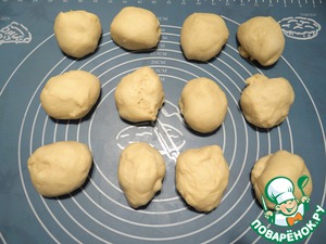 Делим тесто на 12 равных частей, накрываем пленкой, даем тесту отдохнуть минут 15-20.