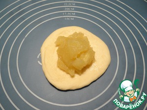 Тесто раскатываем в небольшой кружок, кладем сверху яблочную начинку.