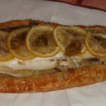 Удаляем запеченный лимон и рыбью кожу. Поливаем рыбу оливковым маслом первого отжима и соком лимона.
