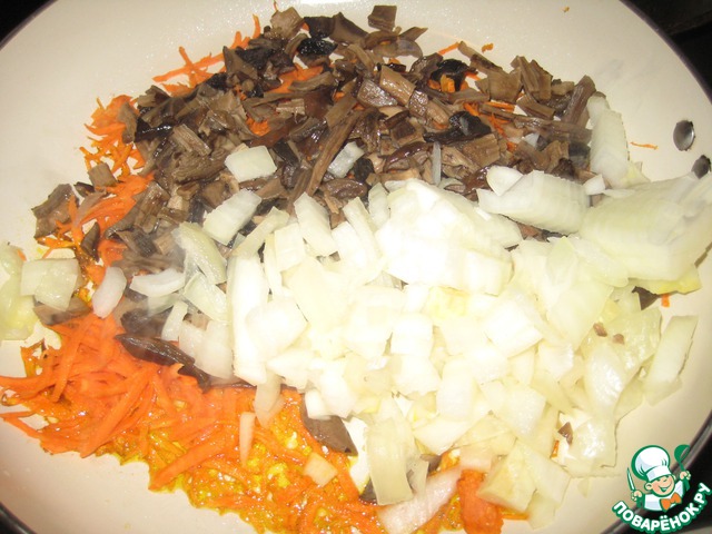 Добавить к морковке мелко нарезанные грибы, сверху -лук. Потушить еще немного, чтобы лучок стал прозрачным, морковка-вяленькой, а грибочки пропитались соком овощей.