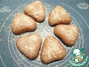 Овсяные хлопья немного измельчаю в кофемолке. Каждую заготовку из теста смазываю водой с помощью кулинарной кисточки, посыпаю чуть измельченными овсяными хлопьями.