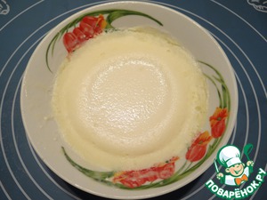 Помещаем миску в микроволновую печь, нагреваем массу на полной мощности в течение 1,5-2-х минут. Массу опять немного взбиваем, снова нагреваем в микроволновой печи на полной мощности в течение 1,5-2-х минут.