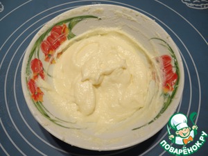 Снова взбиваем массу. Добавляем сливочное масло и еще немного взбиваем массу миксером. Начинка готова. Даем ей немного остыть, накрываем пленкой и оставляем до полного остывания (если начинку не накрыть, верх засохнет).