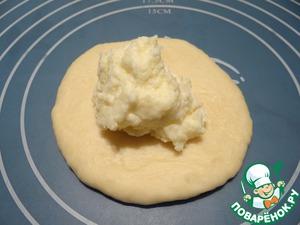 Берем один из больших кусочков теста, немного раскатываем в кружок, кладем на тесто начинку,