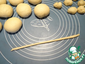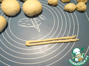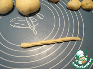 Теперь приготовим украшение булочек. Берем один из маленьких кусочков теста, постепенно раскатываем тонкий жгутик.