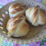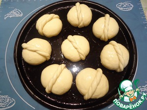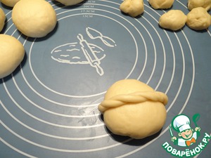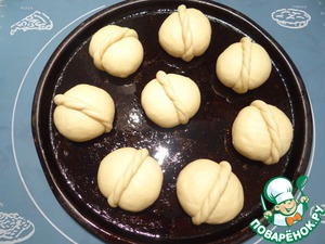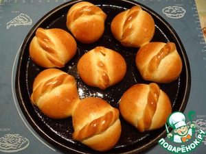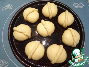Жгутик кладем на середину булочки, подгибаем концы под низ. Таким же образом украшаем остальные булочки.
