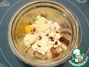 В это время приготовим начинку. В миске соединяем творог, желток, сахар, ванилин, сушеную клюкву.