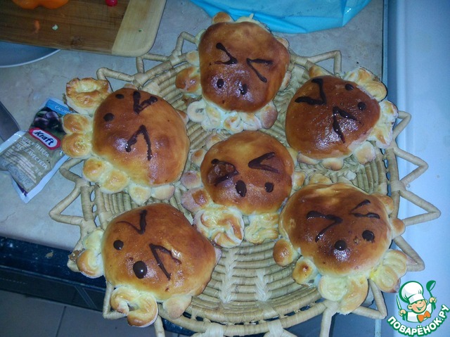 Пирожки "Крабики" с начинкой из творога и сушеной клюквы. Думаю, вы уже успели заметить, что я люблю готовить веселую выпечку для детей. Это один из таких рецептов. Вы можете приготовить таких "Крабиков" из Вашего любимого теста и начинки. Дети будут в восторге от таких пирожков! Идею формовки я взяла опять же с китайского кулинарного сайта.
