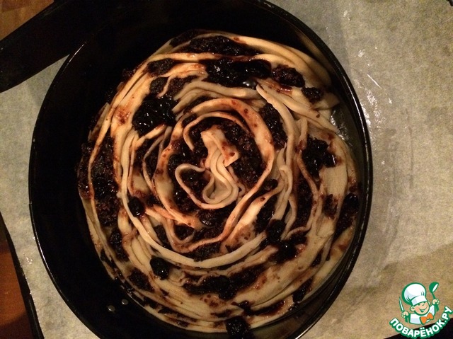 • Не переживайте, если ваша спираль получилась неровной или осталось место между пирогом и краем формы. Во время расстойки и выпечки пирог поднимется и все шероховатости будут сглажены.