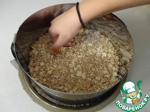 Вафли (оставить несколько для украшения) превратим в крошку с помощью блендера. Выложим измельченные вафли в форму диаметром 22 см и утрамбуем.