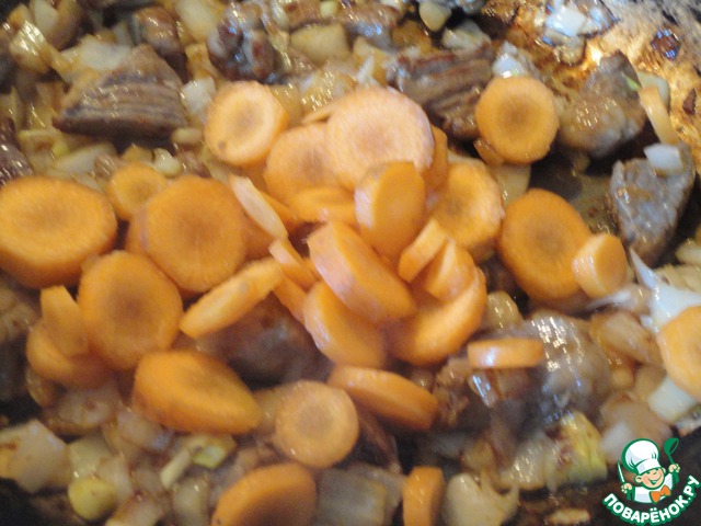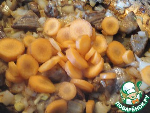 Потом добавляем морковь. Продолжаем жарить, помешивая.