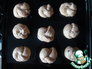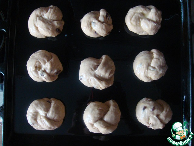Из теста сформировать булочки любой формы, выложить булочки на смазанный маслом противень. Дать им ещё подойти 10 мин. Смазать яйцом и посыпать сахаром.