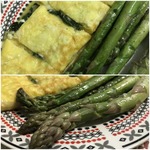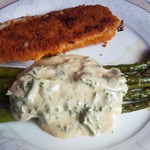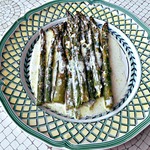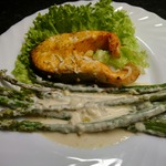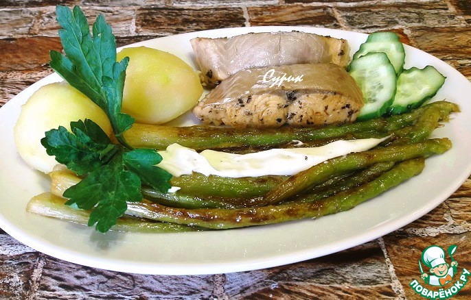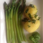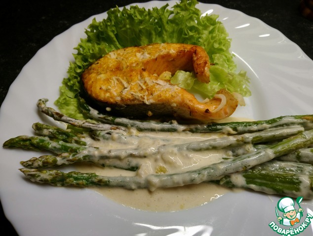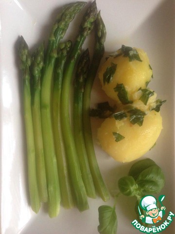 Я подавала спаржу с обжаренным лососем, вареной картошечкой (именно "картошечкой" - специально выбирала поменьше