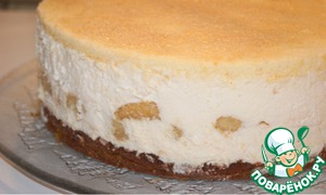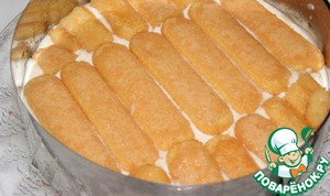 Нанести на корж половину ванильного крема и выстелить сверху савоярди, которые очень быстро окунуть в сироп. Буквально на пару секунд. -
