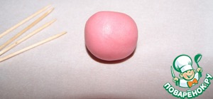 Капнуть в марципановую массу краситель и хорошо размять его руками, работать лучше всего в тонких медицинских перчатках, чтобы на марципане не оставались ваши отпечатки пальцев. Все манипуляции проводим на листе пекарской бумаги, нам также понадобятся зубочистки. -