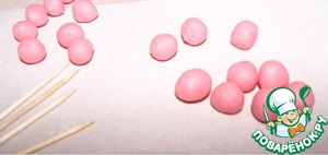 21. Из марципановой массы скатать 9 шариков покрупнее — это для розы и 10 поменьше — для 2-х бутонов.