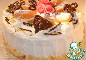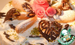 Украсила торт сливками, разрезанным пополам савоярди, поместила в центр розы и шоколадные украшения. Всё! -