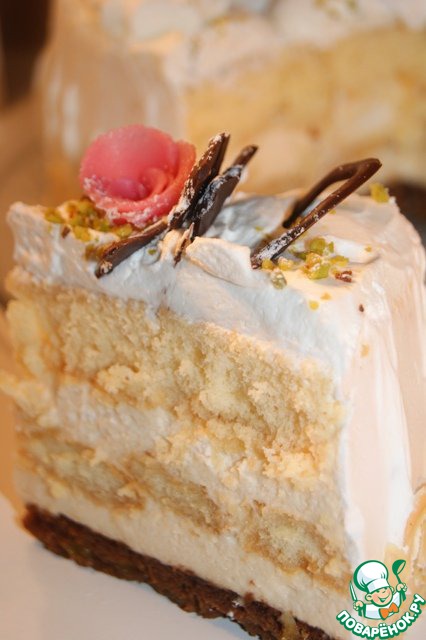 17. Пропитать ванильный бисквит сиропом и поместить его сверху, пропитать. Накрыть пищевой плёнкой и отправить в холодильник на 6 часов, а лучше на ночь.