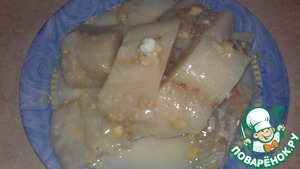 Рыбу почистить, замариновать в получившейся смеси и поставить в холодильник на час. У меня сегодня филе трески из Мурманска, которое, по словам продавца, заморозилось при "очень высоких низких температурах" без применения глазури! Во как!