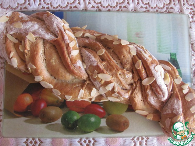 Смазываем плетенку взбитым яйцом, посыпаем миндальными лепестками.