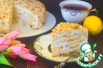 Первый корж я посыпала толченым миндалем, смазала кремом.