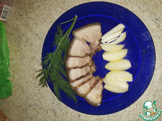 [+5]На куски не резала, был кусок грудинки 600гр., положила в рукав для запекания , в чугуный сотейник налила воды, туда пакет с салом, закрыла крышкой и на полтора часа в духовку (180гр.)