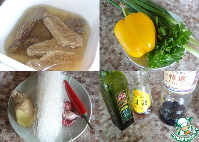 Заранее отварить и остудить в бульоне говядину. Приготовить болгарский перец, лучше разных цветов, чтобы салат был наряднее. Ещё нам потребуется зелёный лук, кинза ( я взяла пополам зелень петрушки и сельдерея, потому что не люблю кинзу)., 3 зубчика чеснока, перчик чили и пучок стеклянной лапши. Обязательно потребуется соевый соус и кунжутное масло. Другое растительное масло может быть каким угодно, но без запаха.