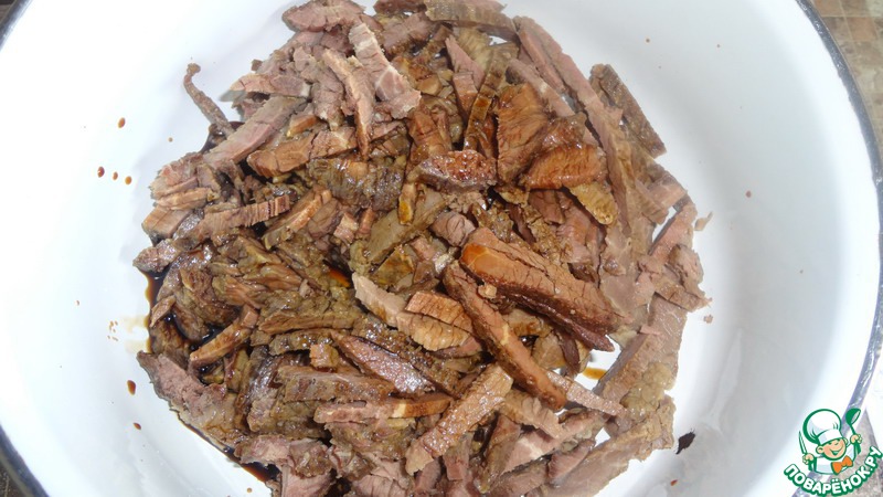 Говядину порезать сначала на тонкие пластинки, потом соломкой. Сложить в блюдо и полить его соевым соусом.