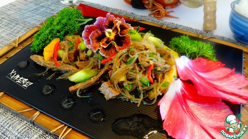 Зелёный лук порезать крупными кусочками по диагонали, сложить в отдельную тарелку. Зелень мелко порубить и добавить к луку. Посыпать 1 ст. л. коричневого сахара и перетереть зелень, чтобы она дала сок и запах. Добавить в блюдо к мясу и перцу. Стеклянную лапшу отварить мин.3-5. откинуть в дуршлаг, промыть холодной водой, чтобы она охладилась. Порезать на доске на короткие см по 6-8 вермишеленки и тоже сложить в блюдо к салату.
