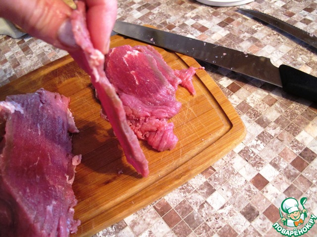 Мясо должно быть слегка подморожено, чтобы его можно было правильно нарезать. Разогреваем духовку. Мясо режем тоненькими ломтиками (как на картинке) и затем на полоски. Натираем маслом, соевым соусом, перцем и солью и оставляем на некоторое время. Нарезаем лук, моем рукколу. В жаропрочную форму выкладываем лук, сверху мясо и запекаем минут 10-15 при 220 С, добавив немного соевого соуса.