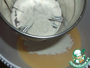 Муку соединяем с разрыхлителем. Просеивая, добавляем к яично-кефирной смеси.