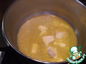 Тем временем растапливаем в просторной кастрюльке 150 г сливочного масла.