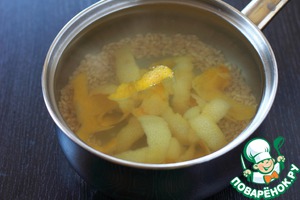 Помещаем крупу в кастрюлю и заливаем водой. Лимоны тщательно моем, обдаем кипятком (а если есть возможность - купите био-лимоны) и снимаем тонкий слой цедры ножом для овощей.