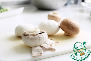 Шампиньоны чистим. Я просто сдираю шкурку ножом и обрезаю ножку, но не мою их. Мои безусловные фавориты - коричневые шампиньоны, у них вкус более яркий и насыщенный.
