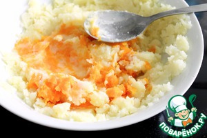 Теперь выкладываем морковку и картошку, которые у нас варились (нужно, конечно же, проверить на готовность). Их нужно потолочь, а затем отправить обратно в кастрюлю.