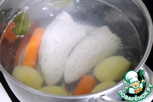 Поставим вариться куриное филе, половину картошки (другая половина нам еще пригодится) и морковь (можно сразу обе, а можно одну, а другую добавить потом). Я всегда добавляю лавровый лист.