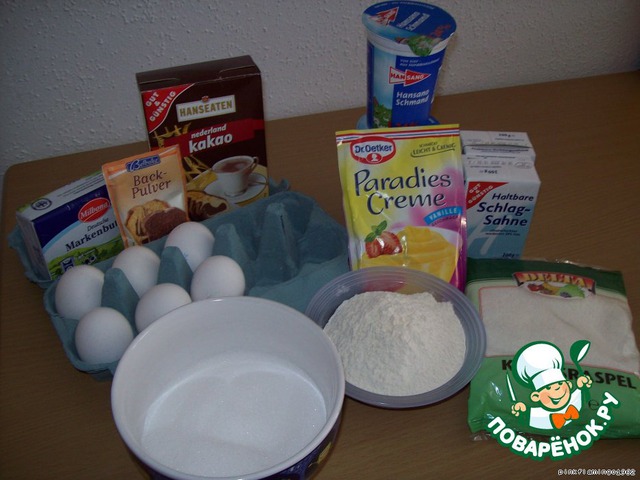 - Сахар (тесто 250 г + 4 стак крем + 100 г посыпка) — 6 стак.