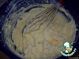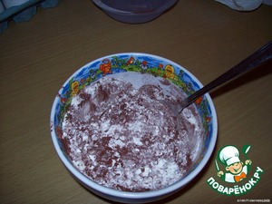 Муку смешать с разрыхлителем и какао. В чашку положить мягкое масло (сильно мягкое, но не жидкое) вбить яйца хорошо перемешать миксером, добавить сахар, вымешать и всыпать смесь муки, хорошо всё вымешать до однородной массы без комочков.
