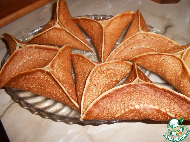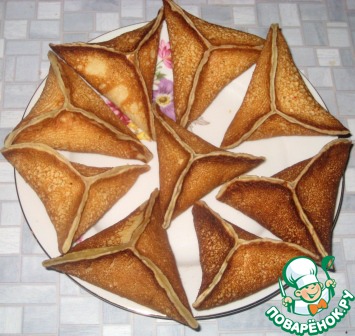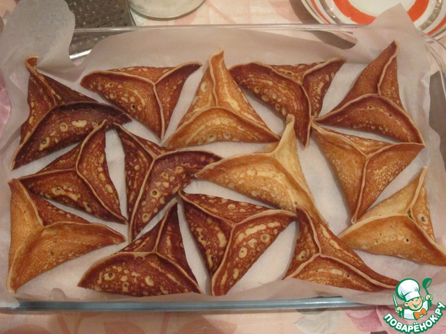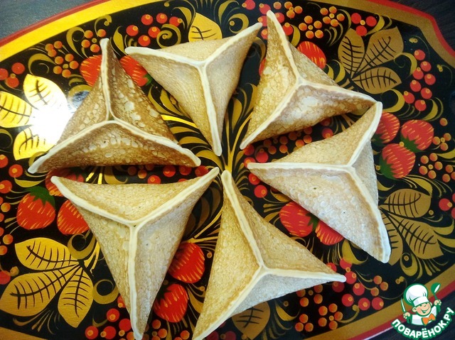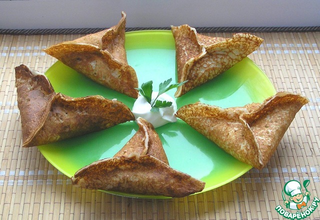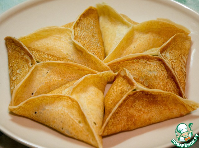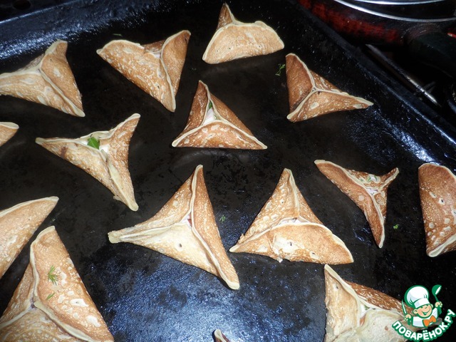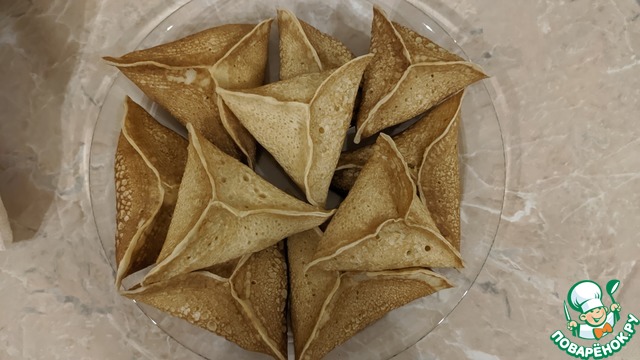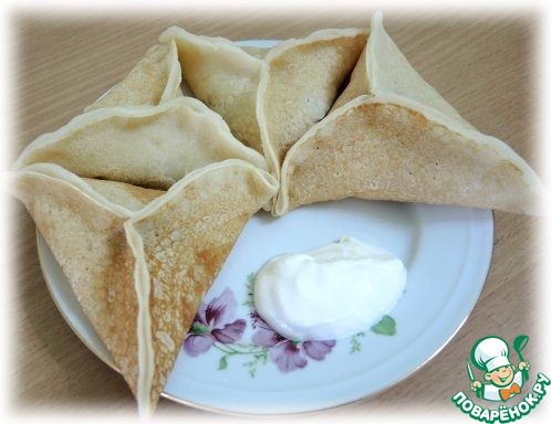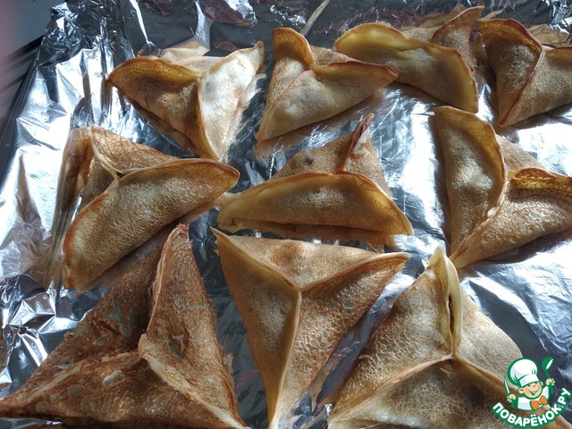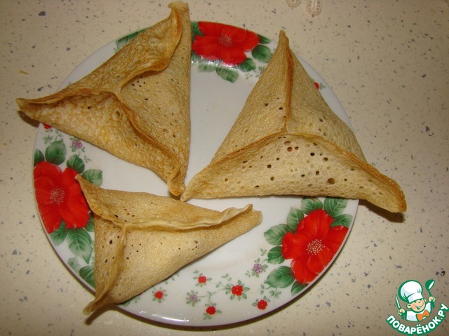 Защипываем края блинчика с одной стороны почти до середины. Потом со второй стороны и третей как на фото.