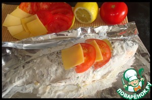 Слегка заворачиваем рыбу в фольгу, формируя бортики (чтобы сок, который будет выделяться, оставался в фольге, а не горел в форме), но не накрывая плотно верх, чтобы сыр, который будет плавиться, не прилип к ней.