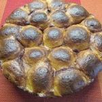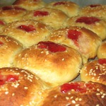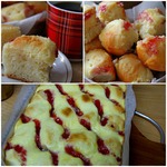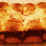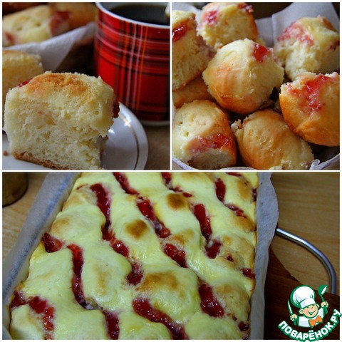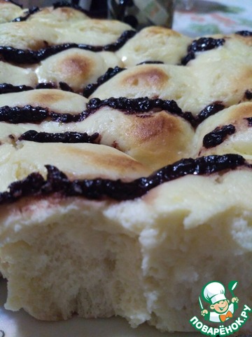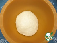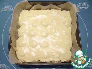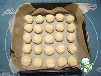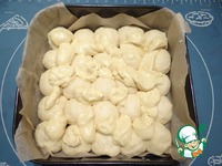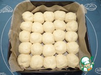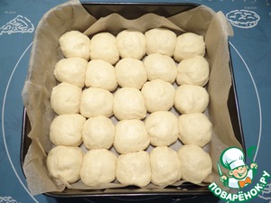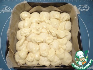 Квадратную форму (размер моей формы 24*24 см) застилаю бумагой для выпечки и смазываю растительным маслом (я не смазала, поэтому потом проблематично было снять ее с пирога, особенно снизу, т. к. пирог воздушный и нежный, при снятии бумаги он стал разделяться на "шарики"). Укладываю шарики из теста равномерно в форму. Можно использовать как квадратную, так и круглую форму для выпечки. Накрываю форму пленкой и даю тесту в теплом месте увеличиться в объеме в два раза. |