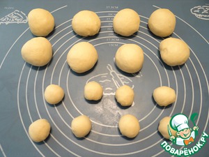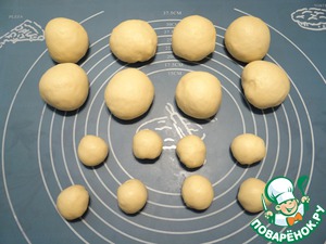 Тесто делим на 8 кусочков по 12 грамм, оставшееся тесто делим на 8 равных частей. Формуем из всех кусочков теста шары.