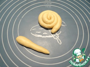 Из маленького кусочка теста формуем жгут, с одной стороны которого тесто должно быть потолще, по форме тесто должно напоминать конус.
