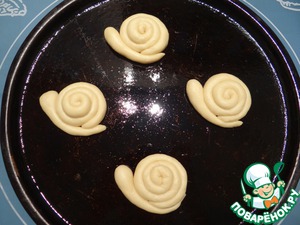 Улитки смазываем взбитым яйцом. Из кондитерского мешка наносим крем по спирали на "домик улитки".