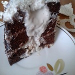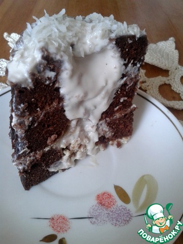 Готовый бисквит пропитываем ликером, украшаем шоколадом, посыпаем кокосовой стружкой. Подавать бисквит с шариком мороженого.