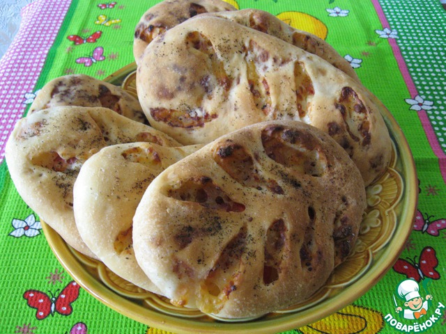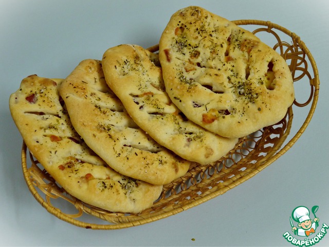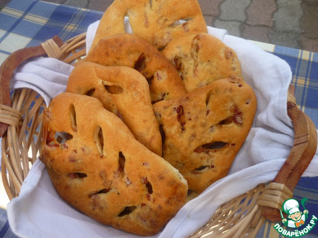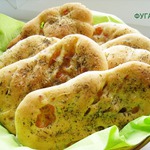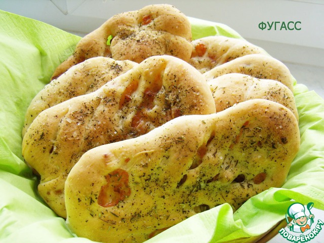 Фугасс – это простая хлебная лепешка прованского происхождения. От любого другого домашнего хлеба она отличается причудливой формой выпечки (в виде листа или колоса), а также разнообразными добавками в тесто, такими, как жареный лук, различные овощи, маслины, анчоусы, пряные травы, и т. д. На сайте есть несколько рецептов этого хлеба, но, я думаю, может и мой вариант кому-нибудь пригодится. Попробуйте приготовить, очень вкусно!