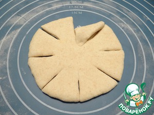 Каждый шар теста раскатываю в круг диаметром примерно 12 см (я посыпала стол немного мукой).